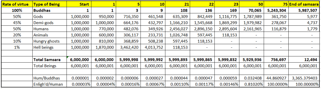 I then assumed a certain percentage of humans attain enlightenment in each period. To calculate the attain enlightenment/human ratio I took the total number of humans on earth divided by the number who I’m estimating attain enlightenment (7.6 billion people, 30,000 Kadampas, 2,500 of whom attain enlightenment = 0.00003% enlightenment rate). With each increase in the number of Buddhas, I assume the amount they bless the minds of living beings goes up 1%, thus increasing the rate of virtue for the human, animal, hungry ghost, and hell realms. I did not assume the virtue rate goes up for beings in the demi-god and god realms because then they get stuck in those realms and never attain a human rebirth. Presumably, Buddhas would bless their minds to take human rebirths.