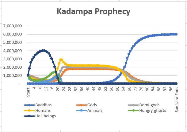 Let me know if you have suggestions on how to change the assumptions of the model. Obviously, this is all an estimate, but it does paint a pretty accurate picture of how things are likely to unfold between now and the end of samsara based upon my understanding of the Kadampa teachings.