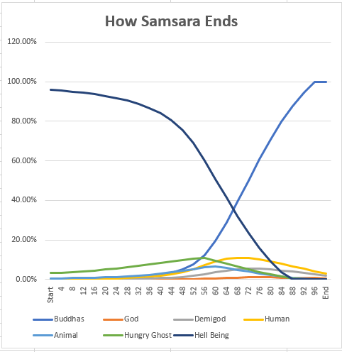 The number of hell beings then quickly plummets, causing the share of the hungry ghost realms and animal realms to grow as more beings are pulled towards the human realm. At around 88% towards the end of samsara, the hell realm is emptied, at 92% the hungry ghost realm is emptied, and at 96% the animal realm is emptied.