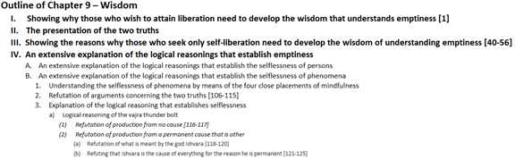 Venerable Tharchin explains that 80% of the meditation on emptiness is identifying correctly the object of negation within our own mind. This is not a philosophical exercise asking ourselves whether inherent existence could exist in the abstract, rather it is a deeply personal investigation of the views held within our own mind to realize how we innately grasp at inherent existence. Only when we fully unearth the different ways in which our mind, perhaps even subconsciously, grasps at inherent existence will contemplating Shantideva’s words produce a profound transformative effect upon our mind. When Shantideva explains the views of the other schools, what he is actually doing is engaging in an extended explanation of the object of negation.