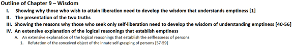 With this background in mind, Shantideva now starts to go look to find our I. He is engaging in an ultimate search. As we read through these verses, it is not enough for us to simply intellectually go through them in the abstract, but we should practically apply them to looking for ourselves. We should be looking for our own I using Shantideva’s words as the pointing out instructions for guiding our own ultimate search for our I.
